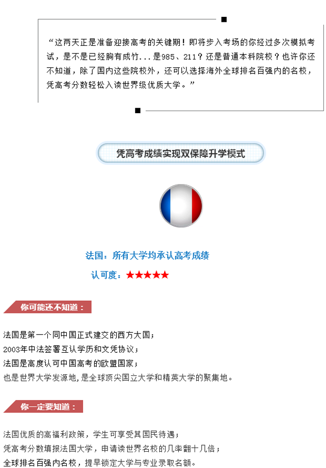 高考升学双保障︱世界排名百位国立大学联招,免学费还可获国家级奖学金! 时间:2019-06-13信息来源:本站原创点击:次【 加入收藏 】【 字体:大 中 小 】 选择法国重点大学-5.20法国宣讲会回顾 高考500分以上超50个专业选择